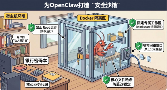 部署时只给AI龙虾完成任务必需的权限,删除文件、发送数据、修改系统配置等高危操作,一定要设置二次确认;建议在容器或虚拟机中隔离运行,形成独立的权限区域,就算出问题,也不会波及整个系统。